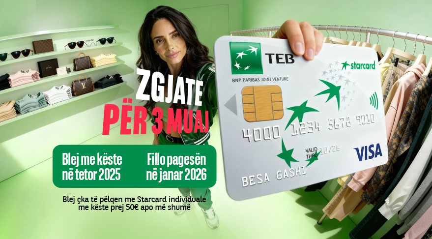 Për çdo blerje në tetor me Starcard individuale me këste në vlerë prej 50€ apo më shumë në POS terminalet e bankës TEB dhe fillo pagesën në janar 2026